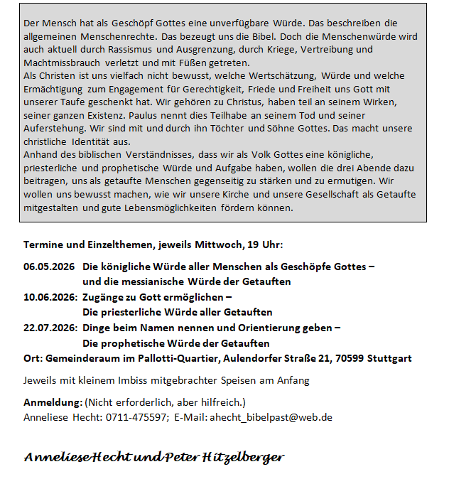 Themenabende zum Thema Taufwürde im Gemeinderaum im Pallotti-Quartier
